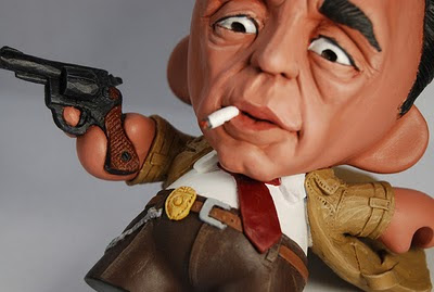 As I said before, I try to be sure my clay adheres to the platform by either roughing it up or screws. Sometimes I’ll do a very basic pencil sketch on the vinyl to be sure of placement. Then I place the clay on using one of the aforementioned clays and work it until my finished sculpt is done. With Sculpey products I like to use a heat gun to lock things in place and then periodically bake it in my oven. I keep the temp down low, 225 F for 20 minutes and then put the oven to warm and do another 30 minutes. To help I might use an armature made of various wires, plumbers putty, tin foil and floral wrap. The floral wrap is great for keeping tin foil in place. Once done I generally prime the sculpt with Dulpi-Color Sandable Primer. This is an auto primer that can be found at auto parts or department stores. Then I use acrylic paints that I hand brush. I’ve always thought having a air brush would be so cool but I’m now leaning toward sticking with the brush. I think I just like to push both clay and paint around. I think an airbrush would just be too slick for me. For now at least.