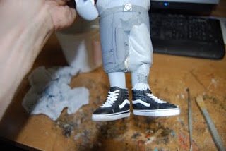 Now that I\’ve carved away everything I need for the moment it\’s time to fix the fit. I fill in the empty sneaks with my magic sculpt and use the sneaks as molds. Essentially I\’m creating feet with the negative space.