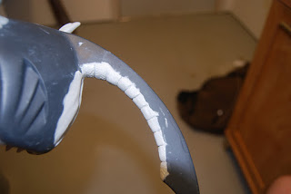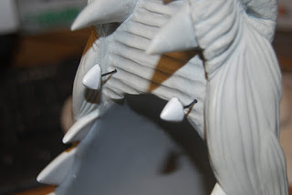Here I\’ve furthered the hair on the snout and eyebrows and blocked in the two large front teeth. I\’ve also added armature for two large horns. And last but not least, I\’ve nervously cut away most of the back fin to create what will hopefully be a more dragon-ish tail. Just sorta winging this.