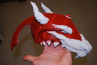 I still didn\’t know exactly what I was going to do or if it was going to work, just sort of winging it but here the vision starts to come to me with the big ole dragon nose. Once the nose is there I start adding japanese style dragon hair. And you can see I\’ve repositioned two of the old teeth.