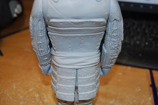 I\’ve now got the legs done with completed feet, hakama (pants) and thigh guard. Now I begin making the kusazuri (tassets). I want these to be rigid and stand off the body as much as possible so I use some vinyl card I had and glue them in place to the sculpt. You can also see that I have cut away the arm wrap and the hips to level out the vinyl.
