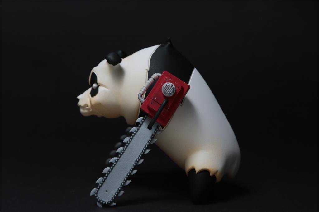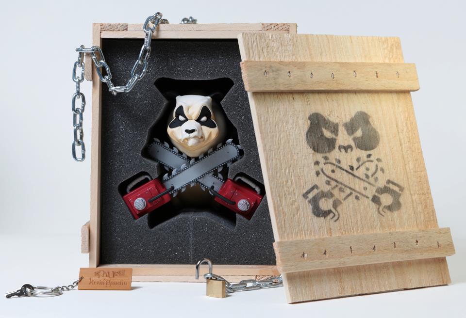 Limited to only 30 pieces. Each 5.5\” tall Panda and its articulated chainsaws are sculpted, cast in solid resin, and hand assembled by Kevin Gosselin in the United States. They are then shipped to Canada where they are hand painted and packaged by Eric Pause. Securely set in laser-cut black sponge, and packed in a custom hand-made and decorated wooden crate. The crates come complete with a removable padlock and metal chain, laser-etched bamboo key chain, and individually signed and numbered printed cards. The Chainsaw Panda piece is made entirely in the USA and Canada.