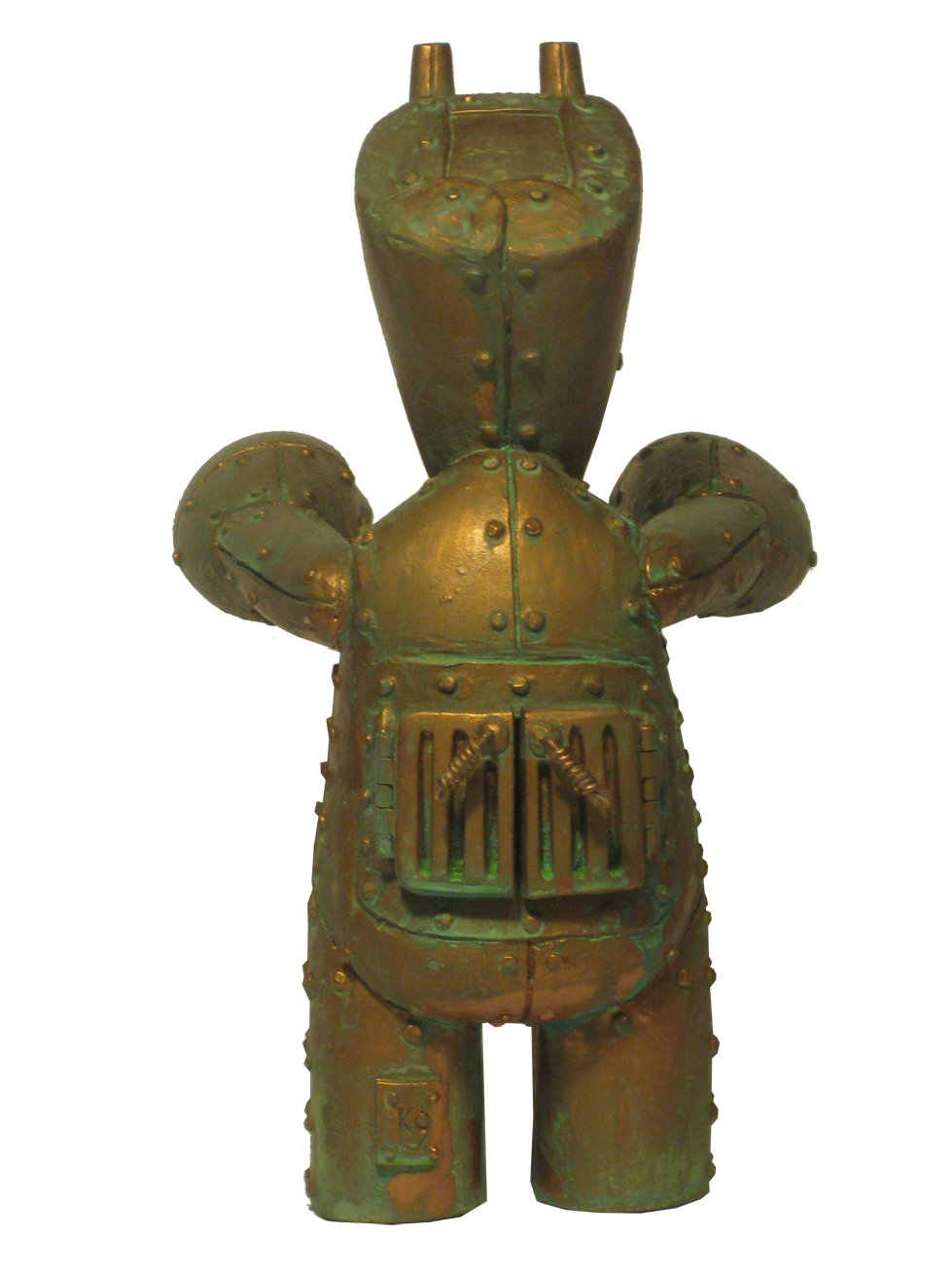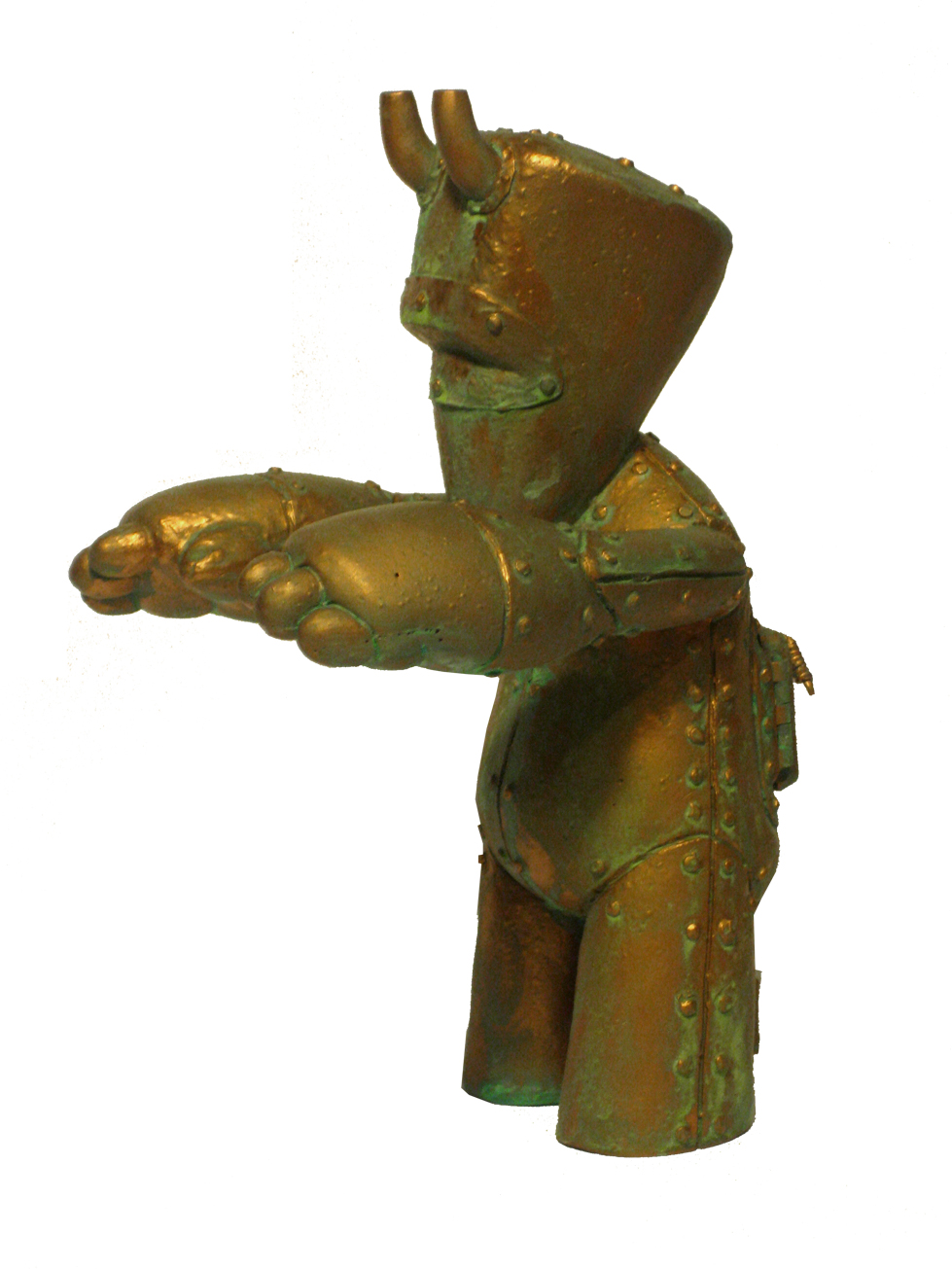 I actually finished this guy last week but just have been busy with a commission (which should hopefully be done by the end of the week). I\’m not completely satisfied with it due to it\’s imperfections but that\’s OK cause I really like the concept. I\’ll be continuing with this guy until I get it right. I made this guy using the last of my poor casts. So he was rough to begin with. I think for that reason I sped through the process just to get it done and realize the concept. I also used copper paint(Modern Masters) and patina glaze to create a more realistic finish and go figure, I like the fake spray paint and green acrylic aging I did before better. This just seems too aged. Thoughts?
