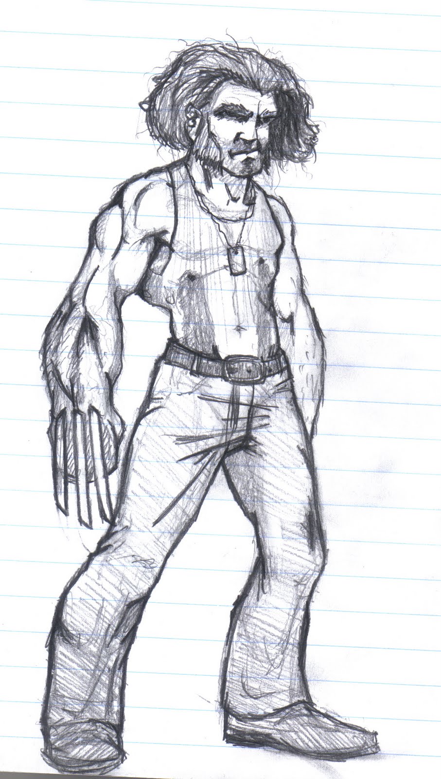SO, with that in mind I\’ve decided that Wednesday\’s are going to be for illustration from now on. You know, that thing I got a degree in about 14 years ago and decided not to use. I feel if I do a illustration every week for the next year something good while come from it. So here\’s my first stab at it. I figured I\’d start with something I love. And I love me some Wolverine. I just did a basic sketch of Logan to get his character down. I always hated the way his hair was done. I mean how does hair grow in up into points? And his forearms, well, I like me some big ape arms, that\’s just me. Which help\’s because they allow for room for the claws. Anyways, here\’s my Logan. Oh, and for the record, I like Hugh Jackman as Wolverine. He\’s great. Just a touch too tall.